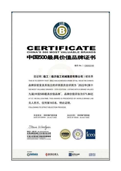 2022年7月26日,由世界品牌實驗室主辦的第十九屆“世界品牌大會”在北京舉行,會上發布了2022年《中國500最具價值品牌》排行榜,臨工集團以571.86億元品牌價值位列165位,連續9年登榜,品牌價值連年攀升。