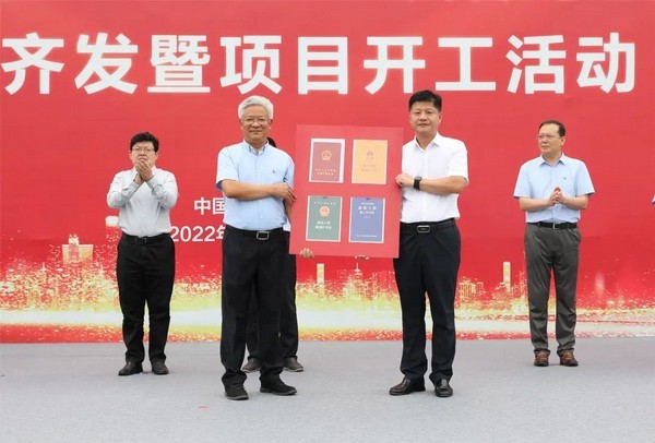 濟南高新區黨工委委員、管委會副主任張磊向臨工重機股份有限公司總經理支開印頒發不動產權證、建設工程用地規劃許可證、建設工程規劃許可證、建筑工程施工許可證。
