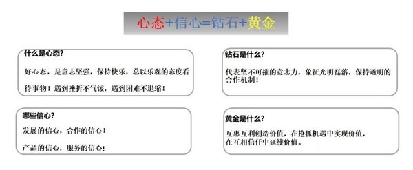 于孟生董事長在演講中表示:“心態+信心=鉆石+黃金”